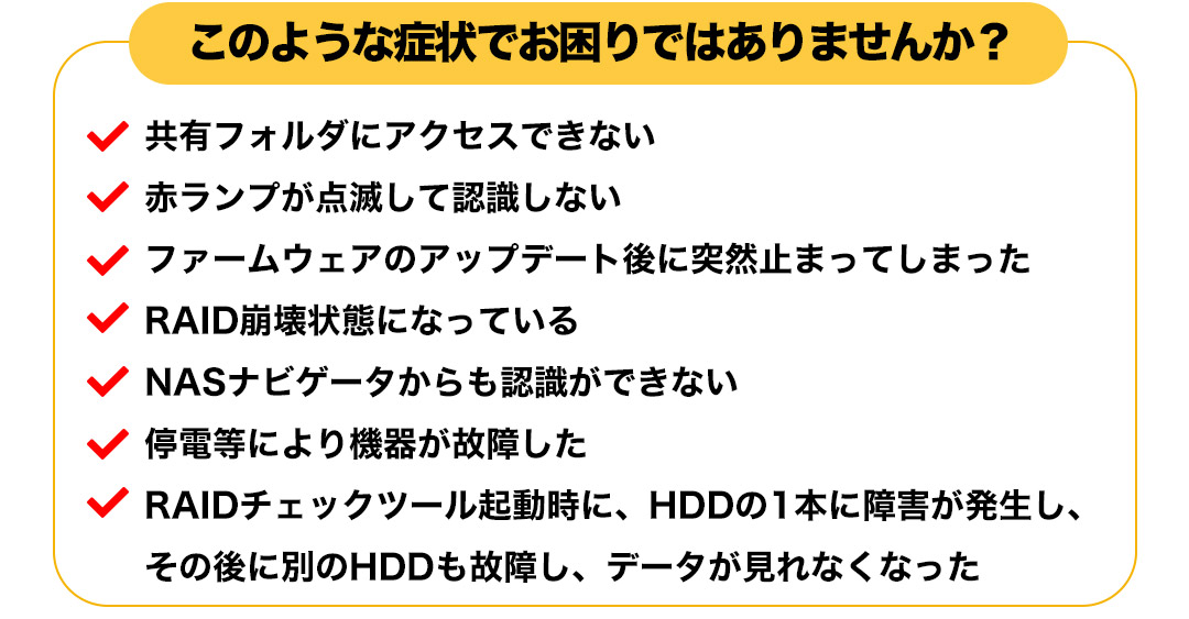 昨日まで普通に使用していたリンクステーションが今朝になりフォルダなどが見れなくなってしまいました。確認するとランプが赤く点滅しており何度か再起動をさせましたが接続できません。図面などのデータが入っており取引先との契約上、機器を持ち出すことができません。出張で対応してもらえるとところを探し御社に連絡致しました。