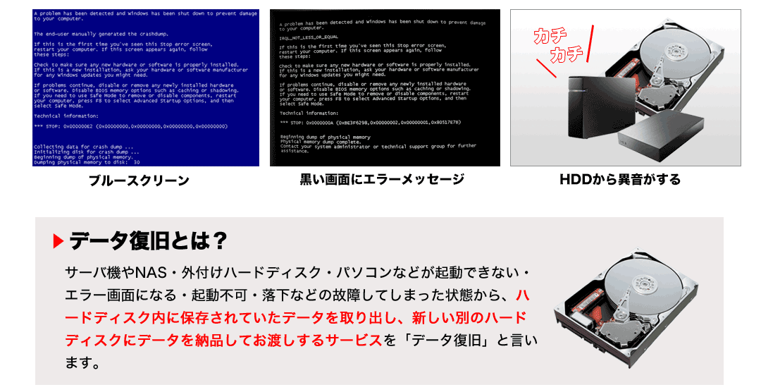 データ復旧専門の会社ですので、セキュリティ強化のために暗号化をかけていたハードディスクや、ハードディスク自体が物理的に故障している重度障害の場合も、データ復旧の対応が可能です。