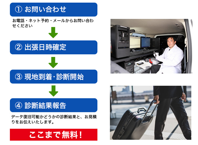 データ復旧がはじめての方へ|データ復旧の流れ|お急ぎの方へ|出張データ復旧サービス|サービスメニュー料金プラン